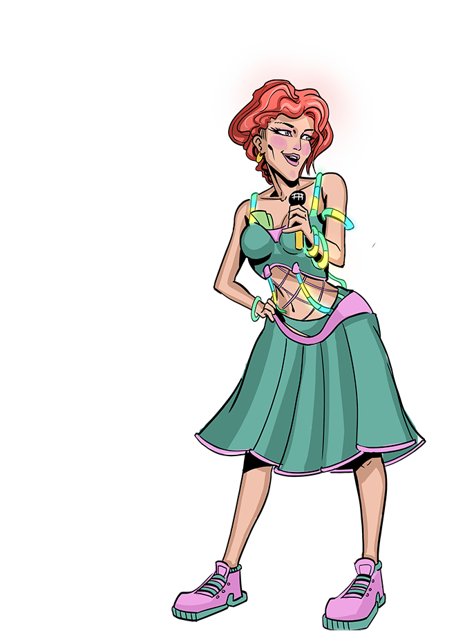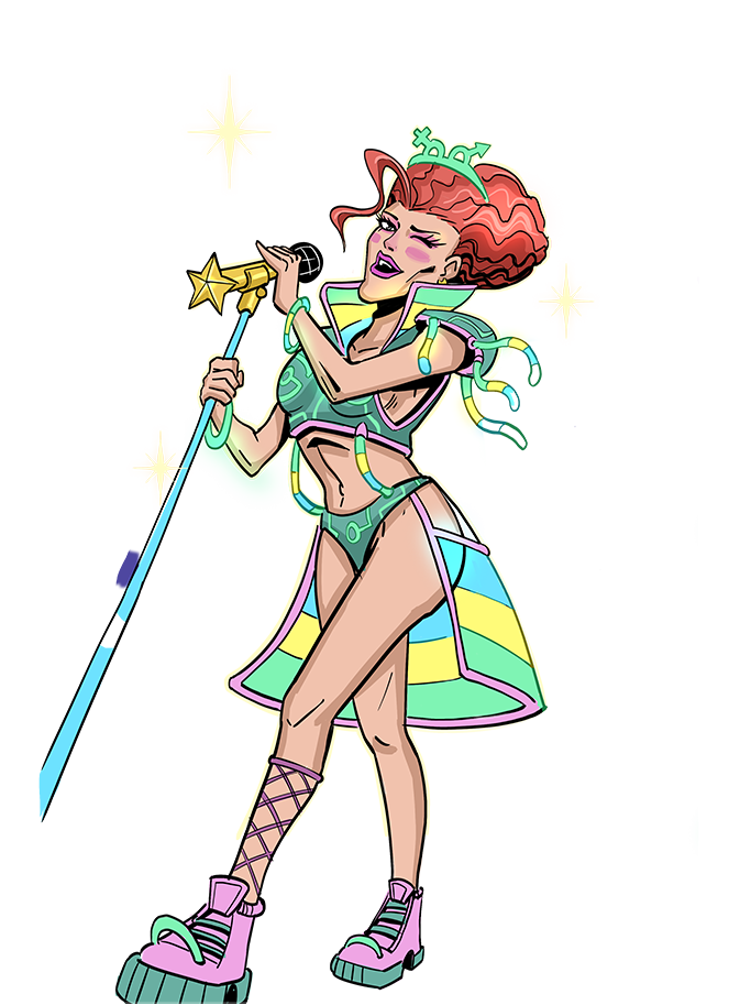 At first, she was just a voice born in a galactic wash station. A vibrant, powerful, insolent voice that sang of queer love, toxic glitter, and freedom under neon lights. A voice that couldn't be ignored, and today, she's an icon of Clint City, where she roams in limousines suspended by drones, with iridescent aluminum capes, interstellar mascara, and a half-human, half-holographic crew. Her style? Ultra pop glam-trash, between kitsch genius and emotional uppercut. Her latest album? Cosmic Tears on a Latex Dancefloor, number 1 on all the charts – even among the Oculus (yes, even Valosy cried). The Uppers love her for her magnetic aura and her ability to make the like counters explode in the red zone.