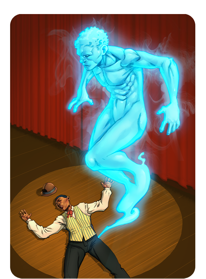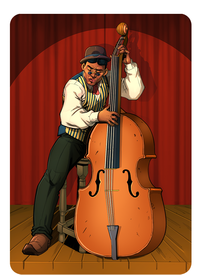 RIP Velvet Lamento, the cursed double bassist, died on stage during a final feverish improvisation... which led to his downfall. This insatiable chatterbox eventually annoyed even Death itself. But the Judge of Death Row is not without humor: he offered him a second chance, on one condition... eternal silence.