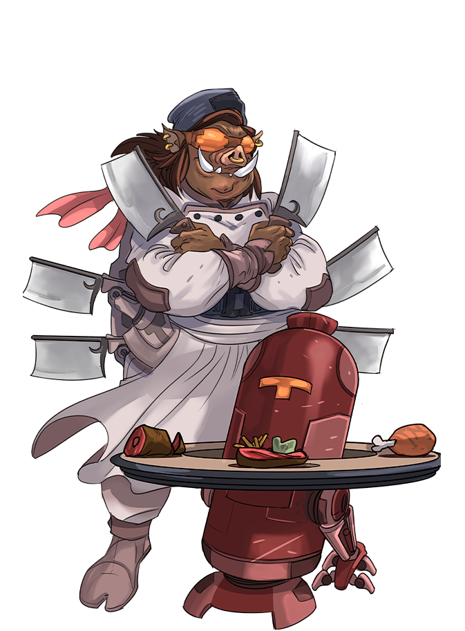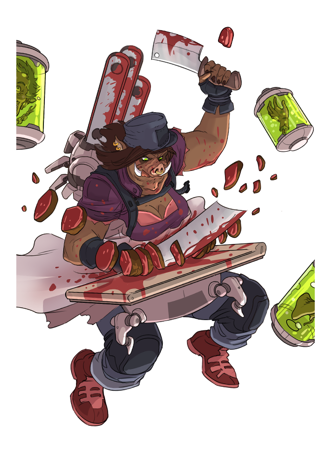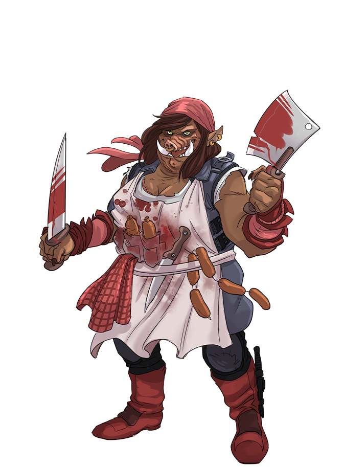 In the Cosmo clan, they don't talk much, they work hard, and they eat what still screams. And Swiggy Sue, well... she cuts. A humanoid sow born in a vat of fermented corn on a forgotten agricultural satellite, Sue grew up among milking drones and comet explosions. By the age of 3, she could debone a spido-beef in less than 6 seconds, blindfolded, with a spoon.
